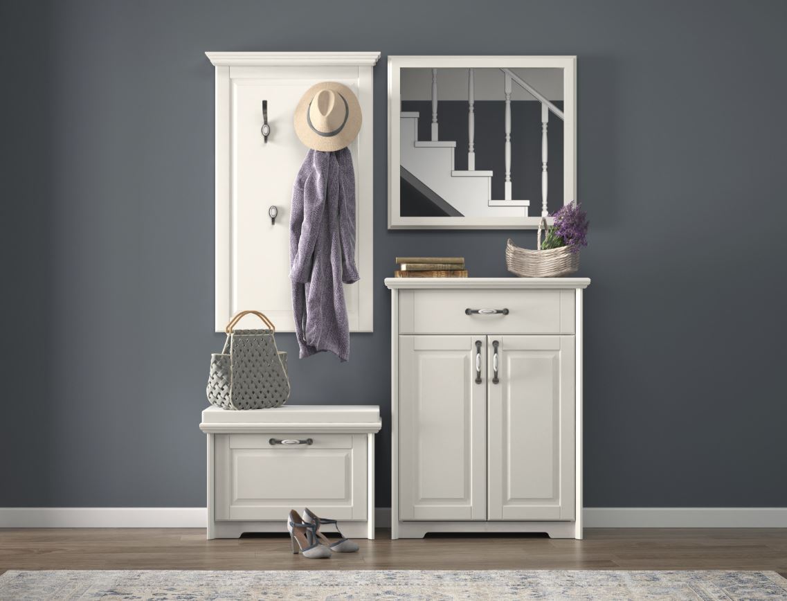 Sorgt für Ordnung in deinem Eingangsbereich: das 4-teilige Garderoben-Set »Evergreen« . Diese Garderobenkombination besteht aus einem Garderobenpaneel, einer Schuhbank, einem Schuhschrank sowie einem Spiegel. Optisch überzeugt die klare Gestaltung in zurückhaltender Farbgebung mit hochwertigen Griffen in Kontrastfarbe. Beim Material handelt es sich um UV-lackierten Holzwerkstoff, der sich als besonders kratzfest und pflegeleicht erweist. Die Füße sind höhenverstellbar, sodass du sie ganz auf deine Bedürfnisse einstellen kannst. Dank der Soft-Close-Funktion schließen die Schranktüren besonders leise und materialschonend. Dieses Dielenmöbel bietet dir genügend Platz für deine Jacken, Mäntel und Schuhe, die du sichtgeschützt und ordentlich lagern kannst. Eine attraktive wie funktionale Bereicherung deiner Diele: das 4-teilige Garderoben-Set »Evergreen«.