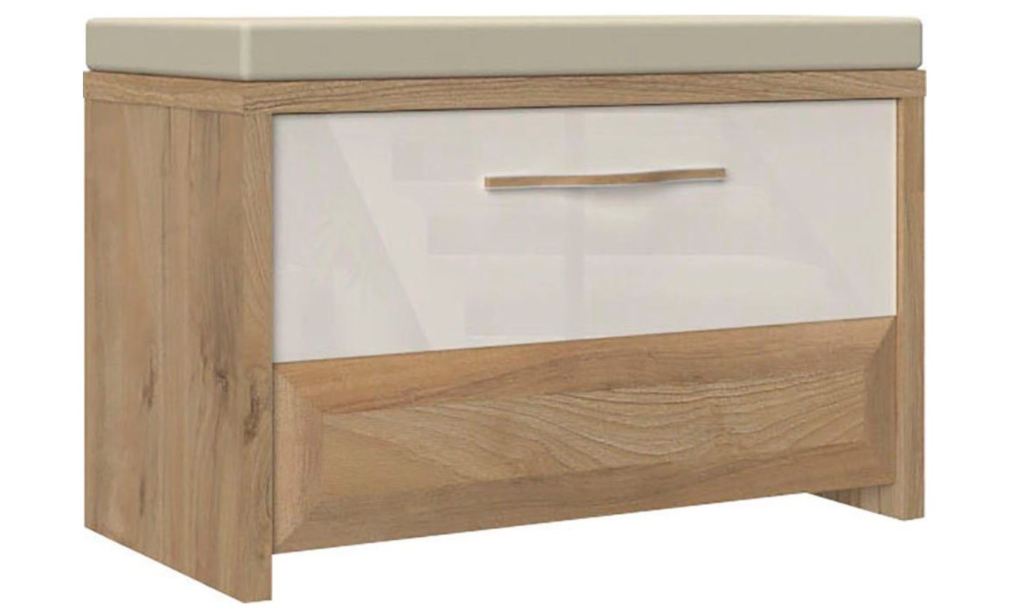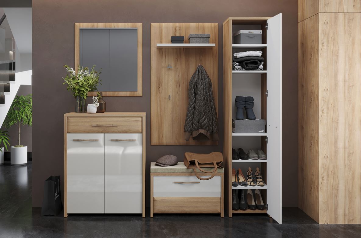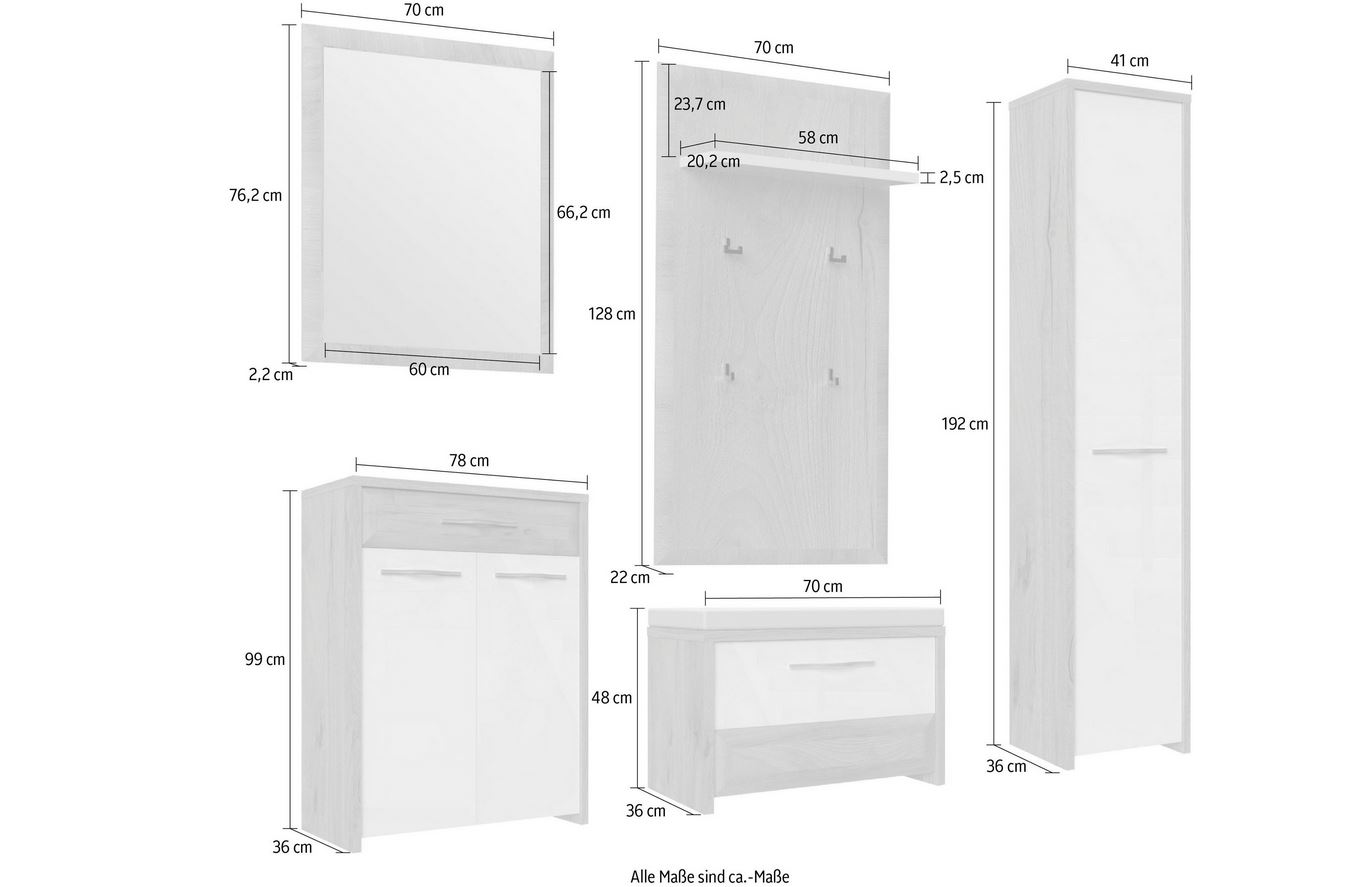 Wohnlich, funktional und nachhaltig: Mit dem attraktiven Garderoben-Set »Gala« mit Soft-Close-Funktion kannst du deinen Eingangsbereich ansprechend einrichten. Geprägt ist das Erscheinungsbild durch den raffinierten Dekormix von UV lackierten Hochglanzelementen und Holzoptik. Abgerundet wird das Designkonzept durch die silberfarbenen Möbelgriffe. Im Lieferumfang der Garderobenkombination sind ein Garderobenschrank, ein Schuhschrank, eine Schuhbank, ein Garderobenpaneel und ein Wandspiegel enthalten. Du kannst deine Jacken, Schuhe, Taschen, Schals und andere Accessoire in diesen Dielenmöbeln ordentlich unterbringen. Gefertigt wurden die Garderobenmöbel aus einem FSC®-zertifizierten Holzwerkstoff. Passt zu unterschiedlichen Wohnkonzepten: das attraktive Garderoben-Set »Gala« mit Soft-Close-Funktion.