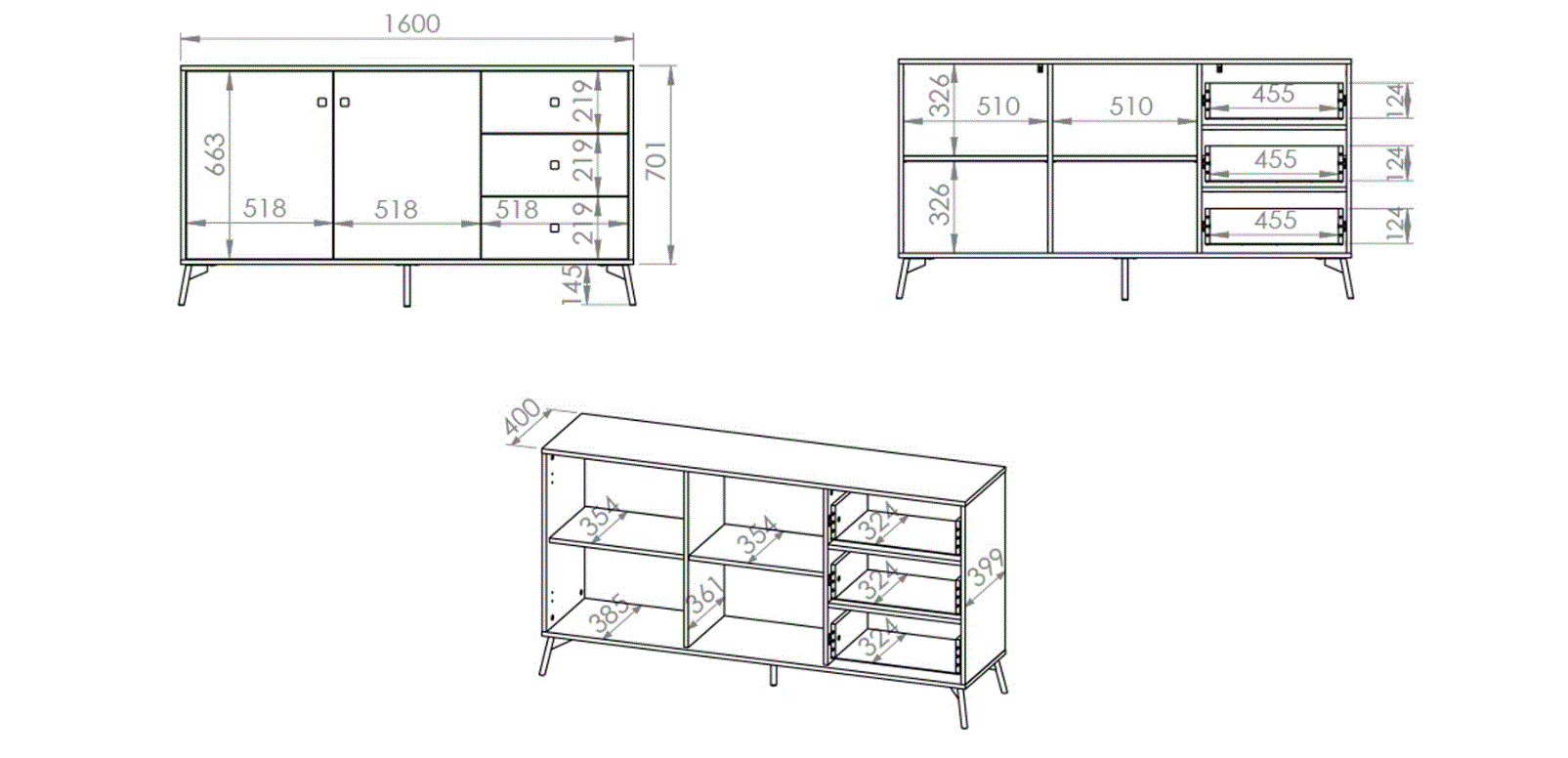 – 2 Türen, 3 Schubladen, 2 Einlegeböden